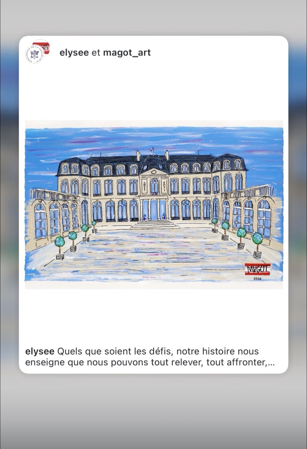 Presse Magot illustre la traditionnelle carte de voeux de l'Élysée, envoyée par le Président de la République et la Première Dame dans le monde entier. Élysée x Magot Lire l'article Cuisinier à l'Élysée le jour, peintre et dessinateur la nuit... Magot nous présente sa collaboration artistique avec la Présidence de la République Le Parisien, Mars 2025 Lire l'article ... il trace son chemin avec une authenticité rare, refusant les compromis et les diktats du marché de l'art... Le Petit Journal de Londres, Décembre 2024 Lire l'article Cuisinier à l'Élysée le jour et artiste peintre à ses heures perdues, Magot puise son inspiration dans le ciel et les nuages. Le Média Positif, Décembre 2024 Lire l'article Magot, Artiste peintre et cuisinier, habitué de la salle, sans table attitrée "Mon nom d'artiste fait directement référence aux Deux Magots" Les Deux Magots « 140 ans d’esprits créatifs à Saint-Germain-des-Prés », Mai 2024 Pas d'article Magot illustre la couverture d'un Menu pour le Président de la République. Le 07/05/2024 Pas d'article GALA STORY, CES DESTINS QUI NOUS INSPIRENT GALA, le 25/01/2024 Lire l'article PODCAST. Success Story : Comment le Toulousain Magot est devenu cuisinier à l'Elysée et peintre à succès à Paris LA DEPECHE, le 21/12/2023 Lire l'article C'EST UN ARTISTE DU XVIème ARRONDISSEMENT QUI A RÉALISÉ LE DESSIN EN COUVERTURE DU MAGAZINE : MAGOT ! PARIS XVI LE MAG (Couverture), le 07/12/2023 Lire l'article MAGOT,LE PEINTRE DES POÉSIES URBAINES PARIS XVI LE MAG (page 43), le 01/09/2023 Lire l'article Finalement, 'le CAPITOLIUM' de l'artiste Magot est parti à Hambourg LA DEPECHE, le 03/06/2023 Lire l'article Magot le peintre chouchou des Medias Bright Magazine, le 18/02/2023 Lire l'article Le Capitole sublimé par l'artiste toulousain Magot LA DEPECHE, le 08/02/2023 Lire l'article Magot et ses 'Esquisses sur toile': le monde rêvé d'un artiste holistique à contre-courant Gala, le 07/11/2022 Lire l'article Cuisinier à l'Élysée et peintre à succès BFM, le 18/09/2022 Lire l'article L'incroyable parcours de Magot, cuisinier de l'Élysée et artiste peintre neo, le 08/06/2022 Lire l'article Magot, cuisinier à l'Élysée et artiste peintre prisé des joueurs du PSG Le Parisien, le 06/03/2022 Lire l'article Les toiles de Magot font craquer le Tout-Paris LA DEPECHE, le 23/01/2022 Lire l'article Instagram Youtube Facebook